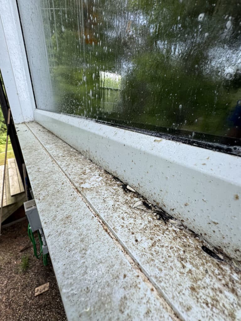 A Clear View Cleaning specialist performing a detailed exterior inspection of a home, checking for surface integrity and protecting nearby landscaping before the cleaning process begins.